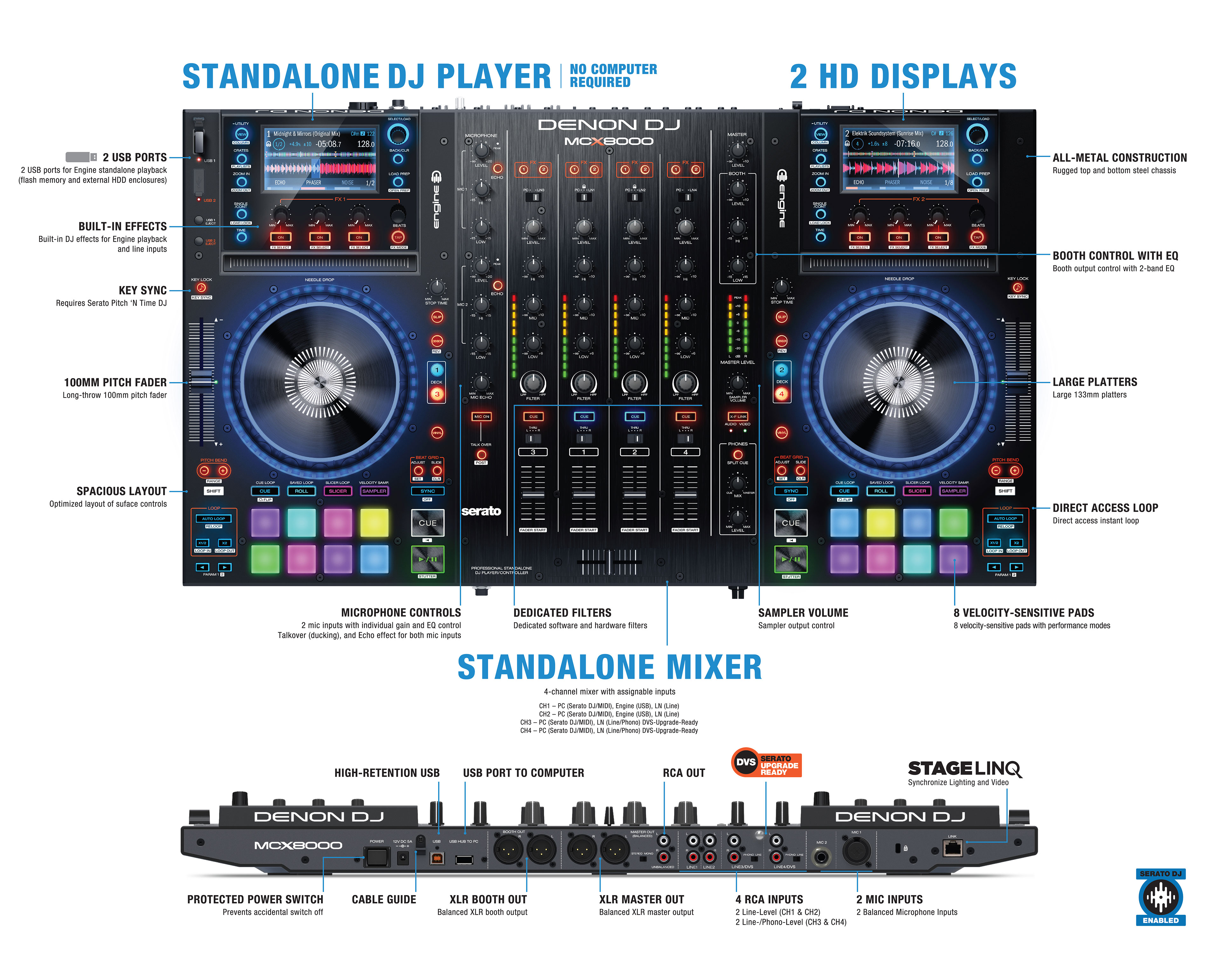 Vous pourrez utiliser le MCX8000 en mode autonome, disposer de vos playlists via les lecteurs USB, jouer depuis Engine pour mixer depuis les écrans intégrés sans le connecter à un ordinateur, via les deux ports USB intégrés ou l'utiliser comme contrôleur classique du logiciel Serato DJ.