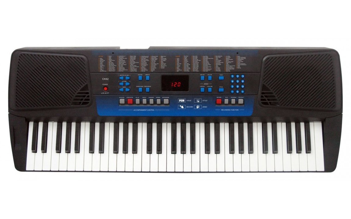 Claviers: 61 touches de taille standard (C1 à C6) Affichage: Écran multifonction LED. Polyphonie: 16 notes maximum Voix: 100 PCM voix, 1 kit de percussion. Commande vocale: Sustain, Vibrato Styles: 100 styles Caractéristiques du style: synchro, Start / Stop, Intro / remplir Contrôle clavier: Normal, Simple, Fingered Démo: 12 chansons